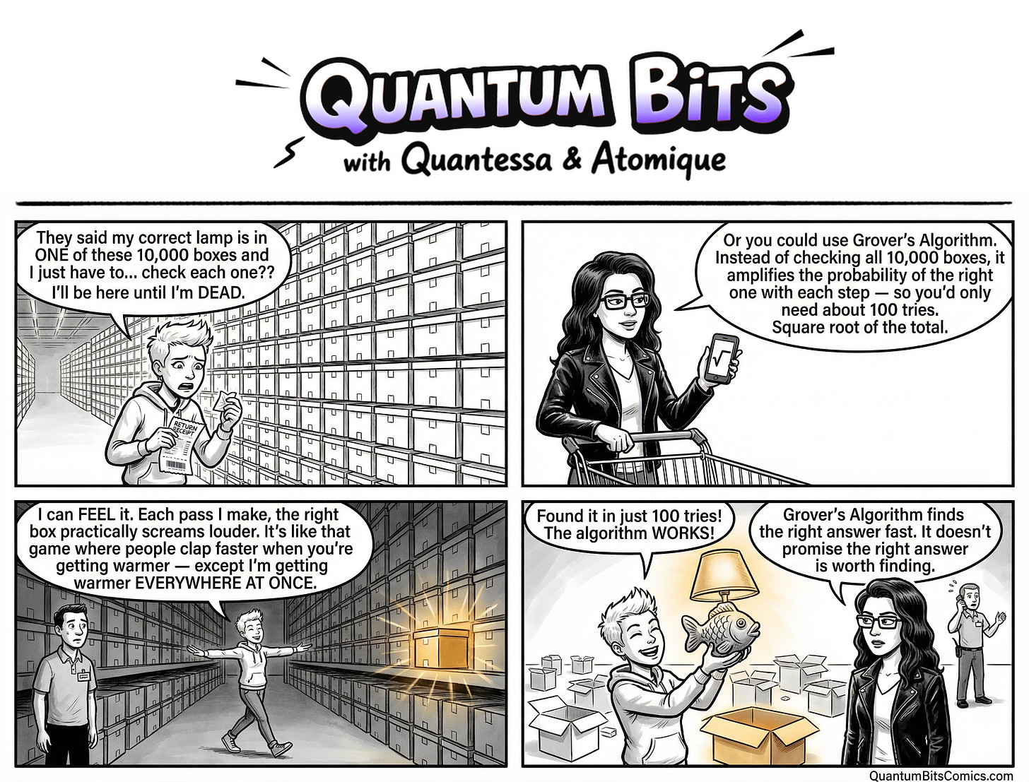 By way of history, Lov Grover published his search algorithm in 1996, and it remains one of the foundational results in quantum computing. The problem it solves is simple: given an unsorted collection of items and a way to check whether any given item is the one you want, find the correct item. A classical computer must check items one at a time. Grover’s algorithm finds the answer using roughly the square root of the attempts a classical approach would need.